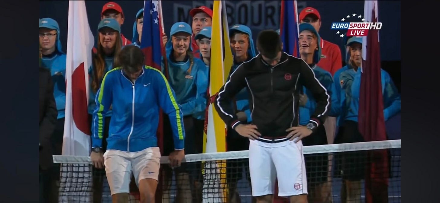 Thanks so much for reading The Golden Rivalry. This chapter was fun to write (this isn’t the best Djokovic-Nadal match, but it may be the most impressive and is my favorite) and challenging (hard to come up with an angle that hasn’t already been done). Hope you liked it. If you’ve been following and enjoying so far, please consider signing up a friend or recommending that they subscribe—by now, you can probably tell that this is aimed at a pretty niche set of readers, and while I’m not concerned with the volume of my readership, I do hope that those who might like this project know about it.
